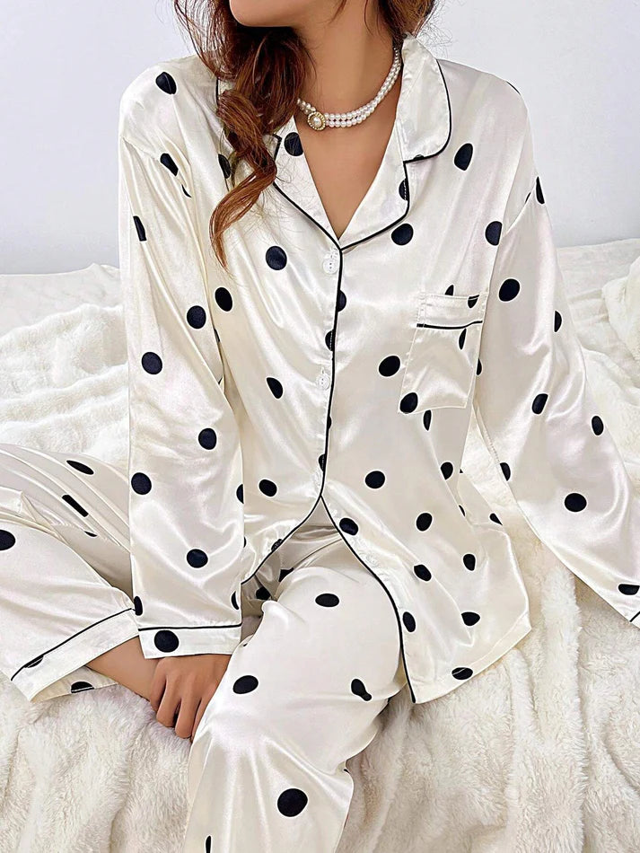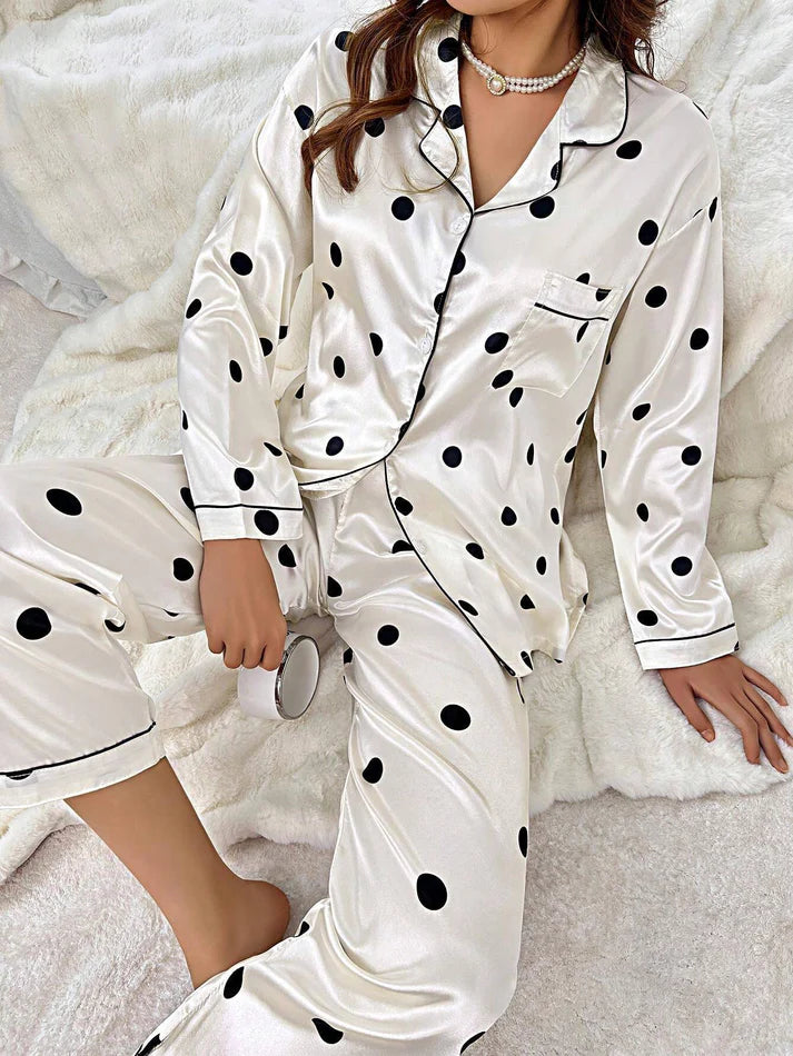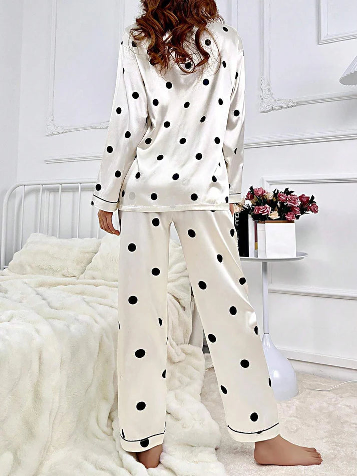 Slip into timeless elegance with this chic satin pajama set featuring a playful polka dot print. Designed with a button-down top and relaxed-fit pants, it offers a perfect mix of comfort and style for your cozy nights and lounging moments.