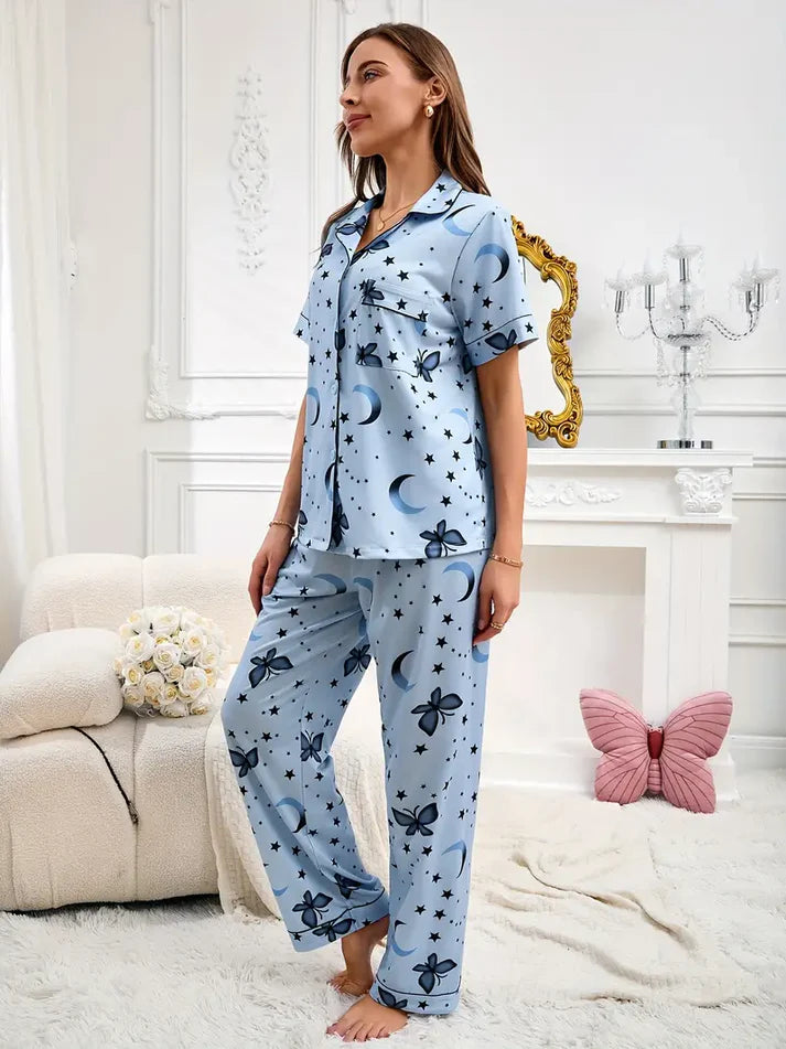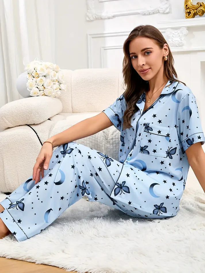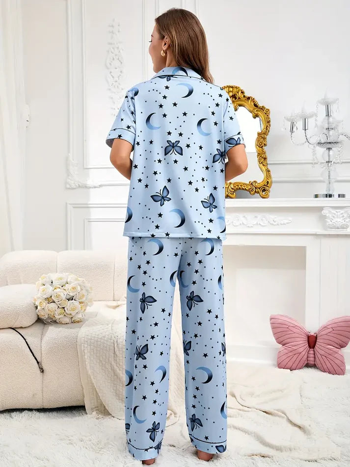 Women’s Lycra Blend Printed Night Suit – Moon & Butterfly Design