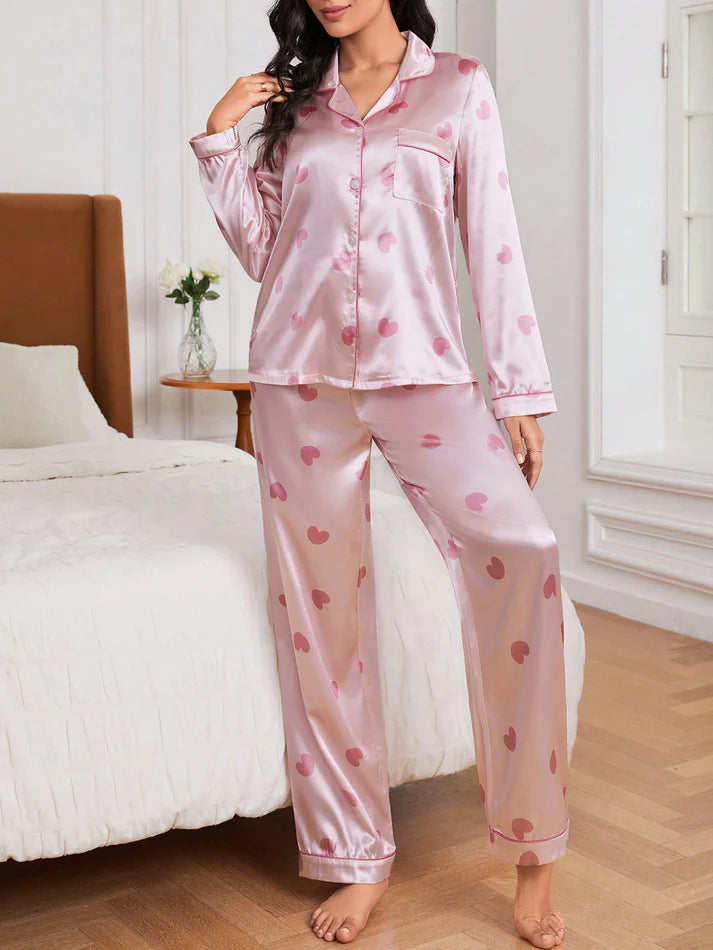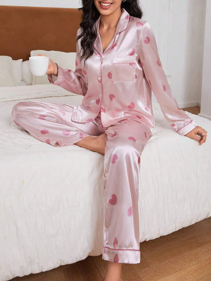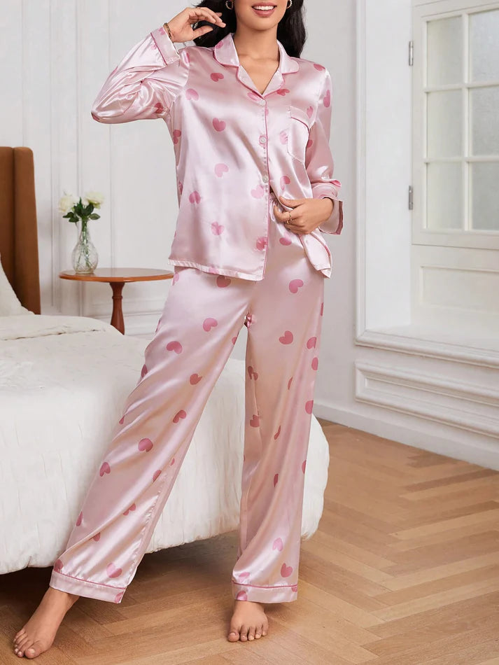 Add a touch of romance to your nightwear collection with this chic women’s night suit, crafted from a premium Lycra Blend fabric. Designed with a silky satin-like sheen, it feels luxuriously soft on the skin while offering stretch and breathability for ultimate comfort. The set includes a full-sleeve button-down shirt with a chest pocket and matching relaxed-fit pajama pants, both adorned with an adorable pink heart print. Ideal for cozy nights, lounging, or gifting, this night suit blends elegance with comfort seamlessly.