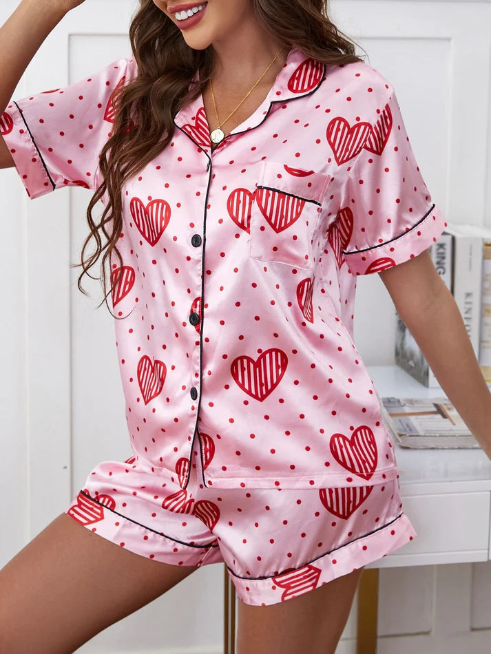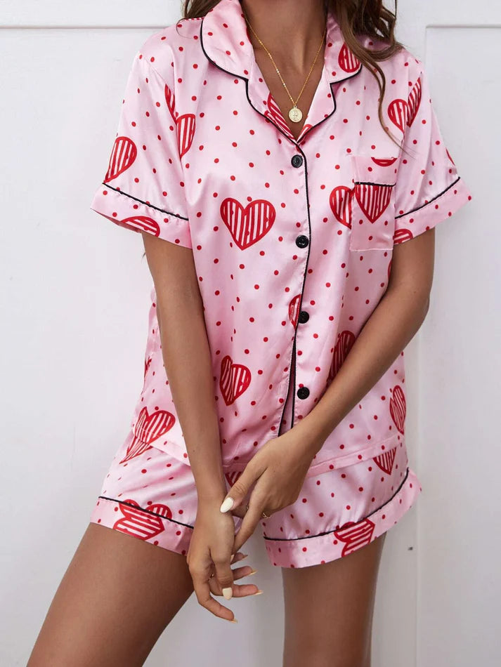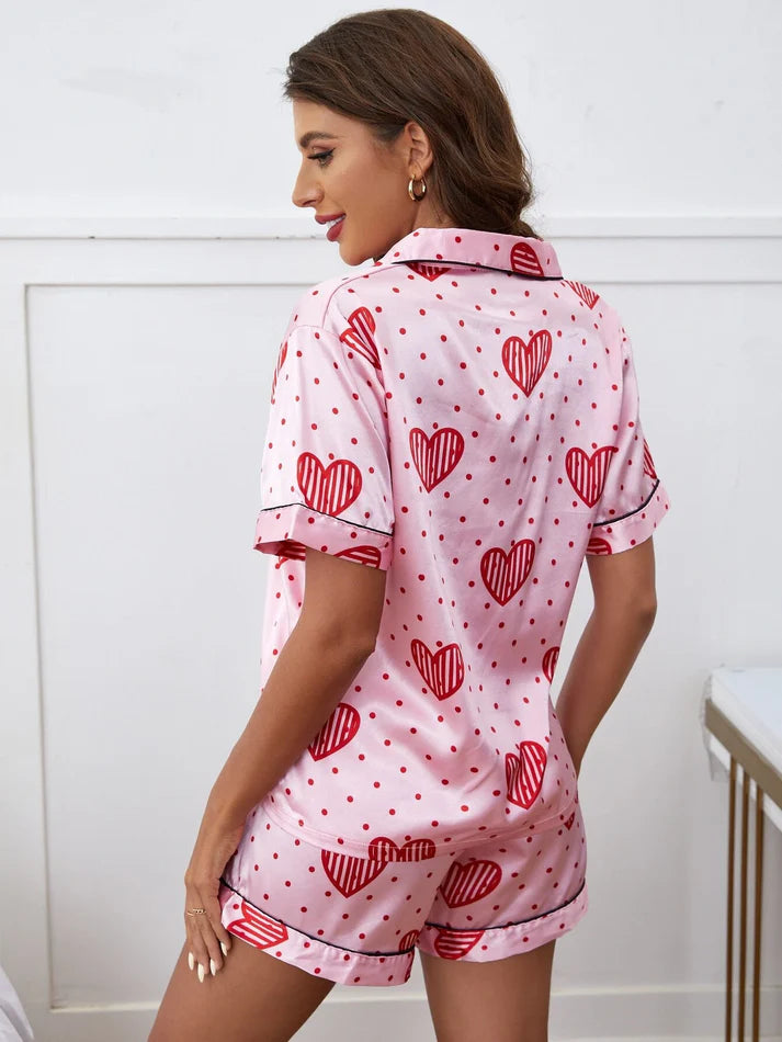 Add a touch of romance to your loungewear with this heart print lycra blend pajama set. Designed with silky fabric, the set includes a short-sleeve button-down top with black contrast piping and a handy pocket, paired with matching shorts for a chic and comfortable look.