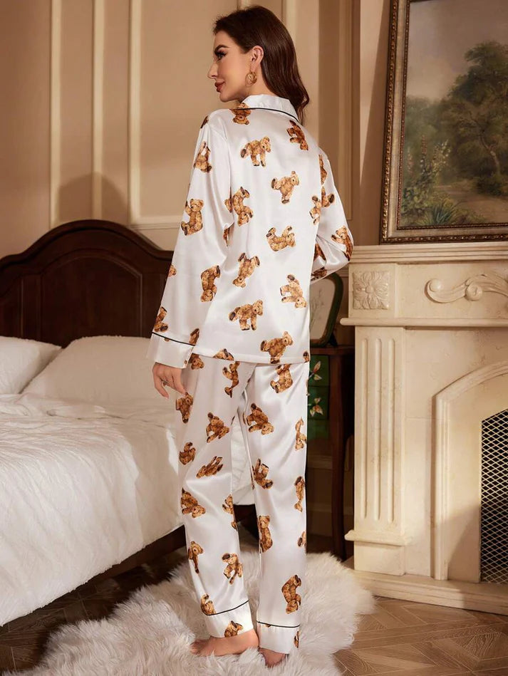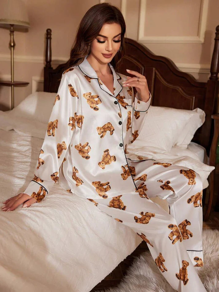 Bring a playful twist to your bedtime routine with this teddy bear print lycra blend pajama set. Featuring a long-sleeve button-down shirt with a chest pocket and contrast piping, paired with matching full-length pants, this set combines comfort and cuteness in one.