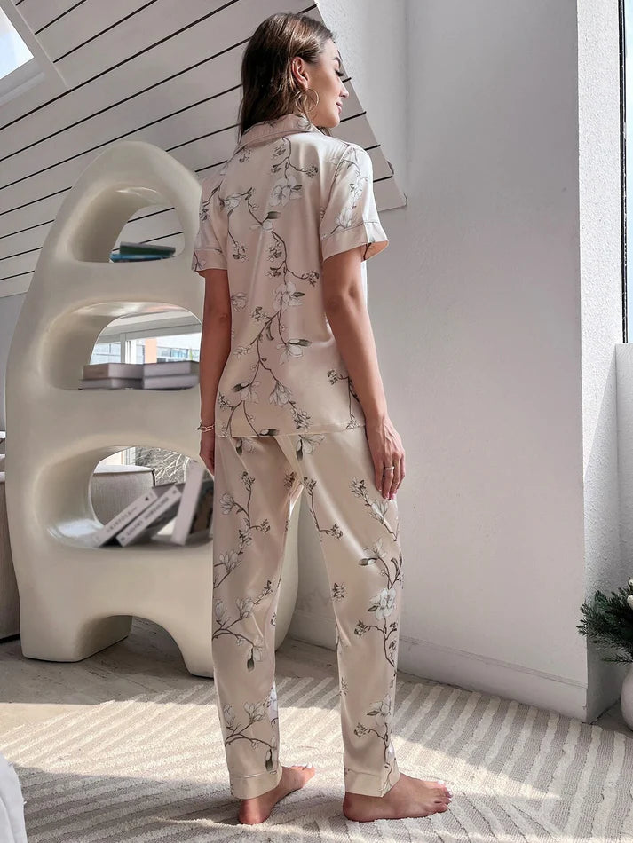 This two-piece set features a short-sleeve button-down shirt and straight-fit pajama bottoms, designed for both style and relaxation. The soft neutral tone with delicate floral patterns gives a classy, soothing look, perfect for bedtime or lounging in style.