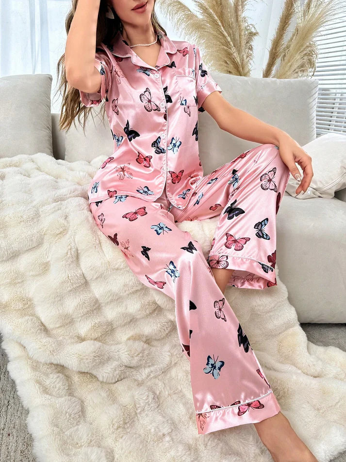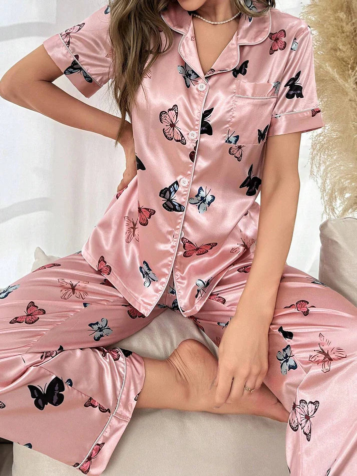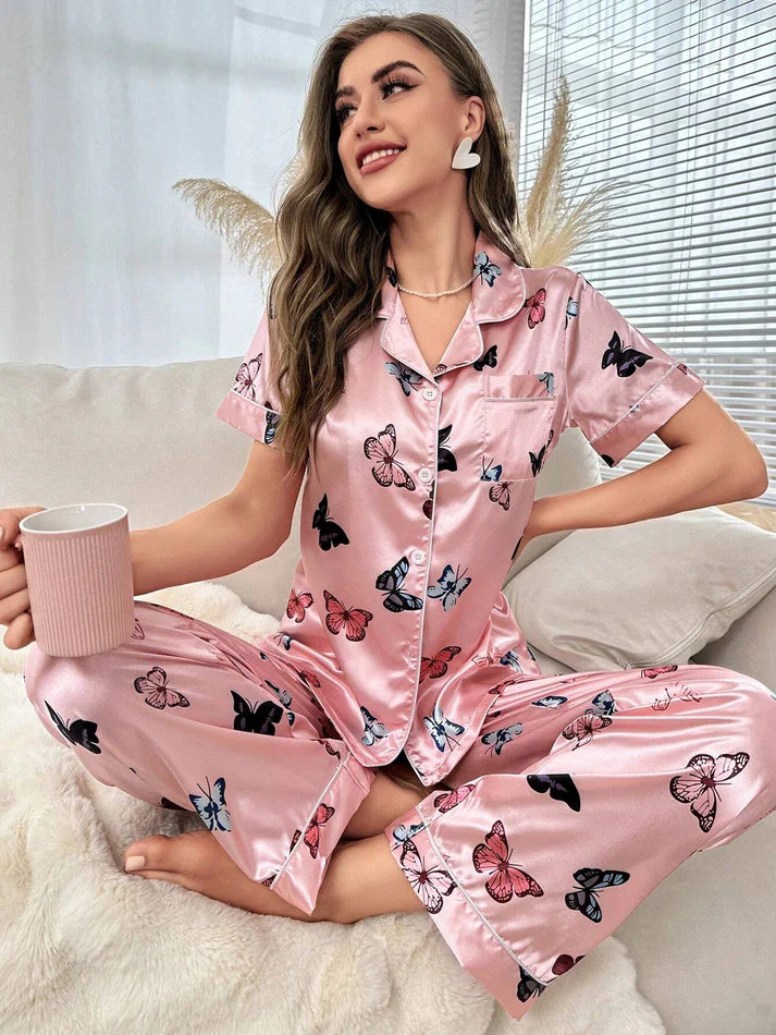 Step into dreamy comfort with this pink butterfly print night suit, designed in a soft and glossy Lycra Blend satin fabric. The silky finish gives a luxurious feel, while the Lycra...