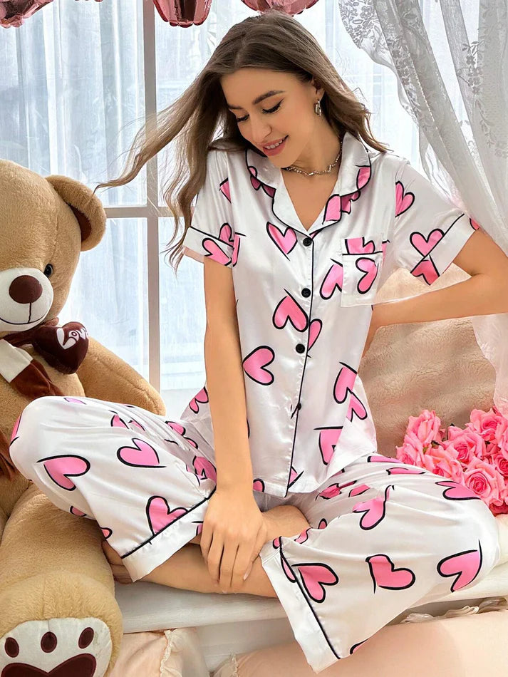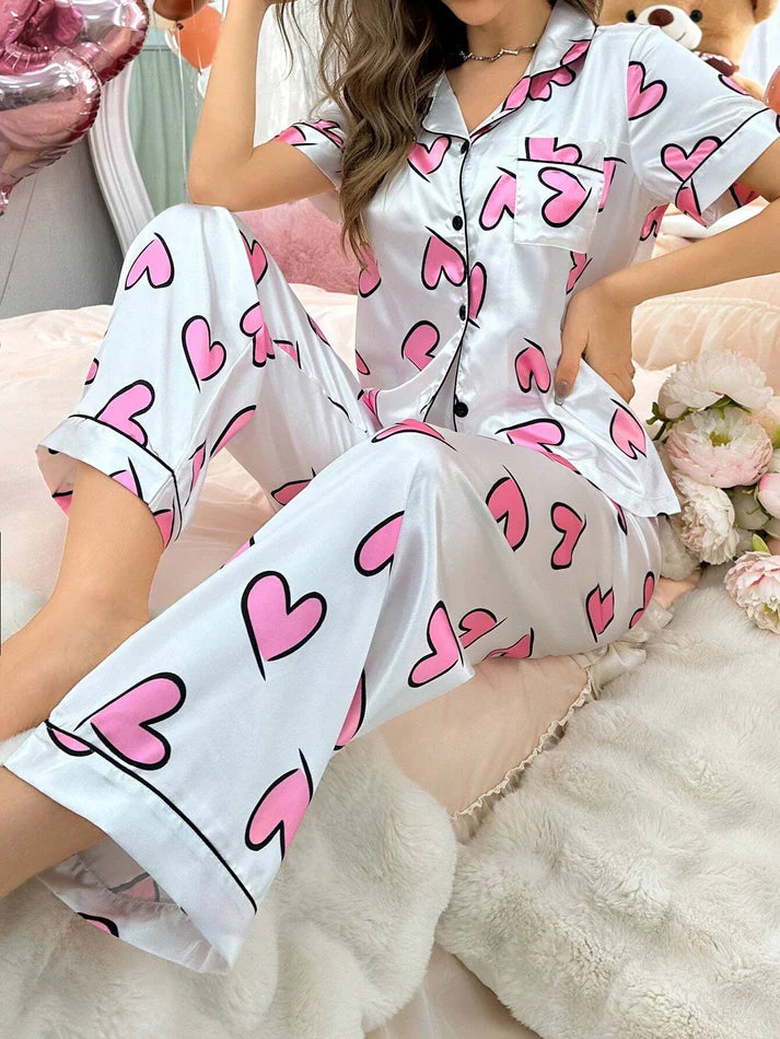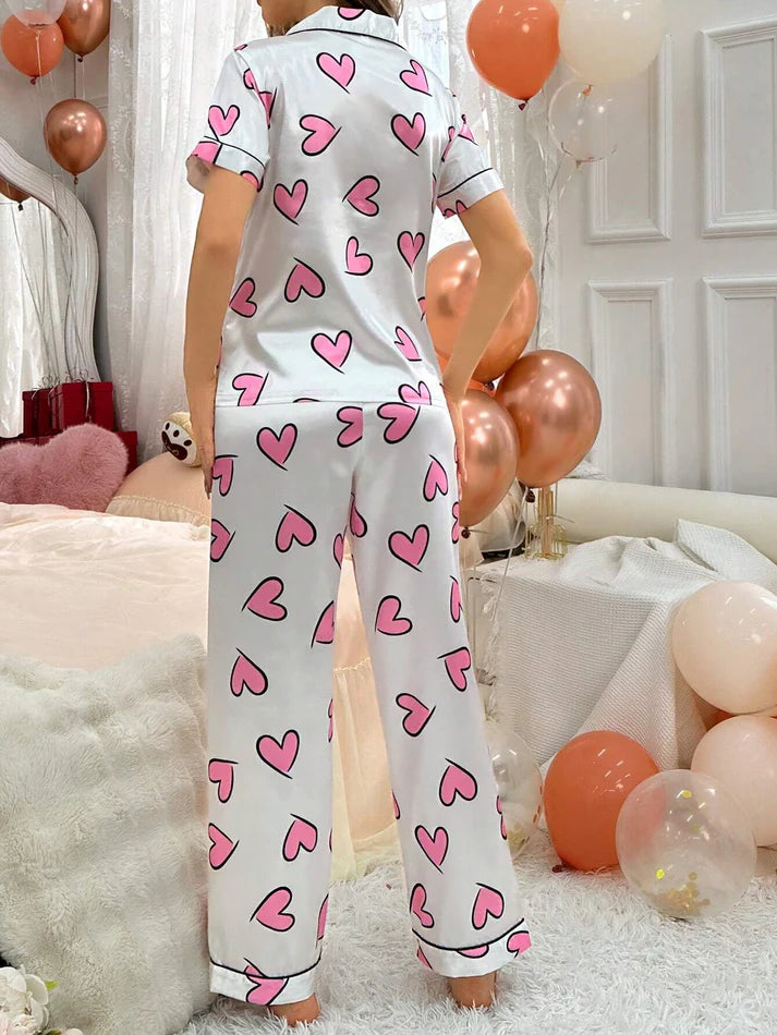 The set includes a short-sleeve button-down shirt with contrast piping and matching pajama bottoms, making it a stylish yet cozy choice for lounging or sleeping. Its glossy sheen and fun heart design bring together comfort and cuteness in one perfect set.